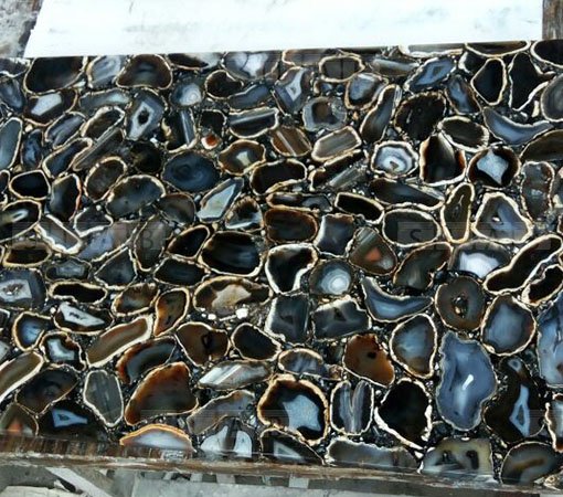 Black agate geode precious stone slabs and tiles in custom sizes. Give your interior an amazing luxury look by using this surface in counter top, flooring, walling, back splash or any other application.