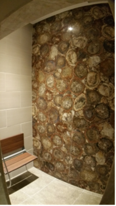 Beautiful petrified wood stone slabs in bookmatched pattern for a interior decor project in Austin, USA. Project owner J.Neal Rutledge specifically ordered 4 slabs in bookmatched pattern and after installing its looking like a single piece of big slab.